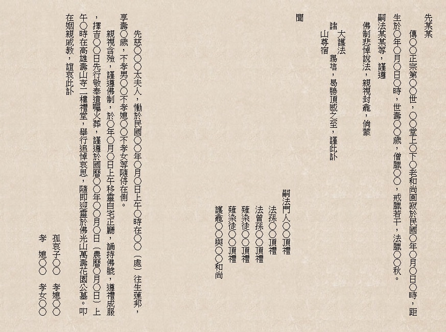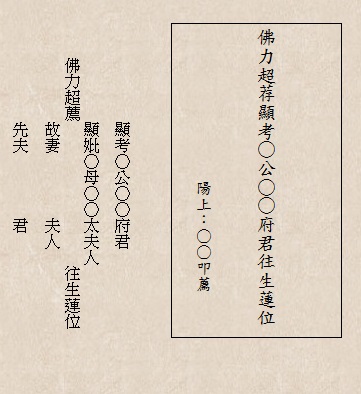 此外,應於門口張貼佈告:*1男眾──嚴制。*2女眾──慈制。*3佛教徒可用黃布條寫「南無阿彌陀佛」,並張貼佈告:「吾家信佛,嚴(慈)往生,承蒙諸位親友蒞臨弔祭,但請上香念佛,可以不必問話,不燒紙箔,不用樂隊,不用花車,不遊街。」